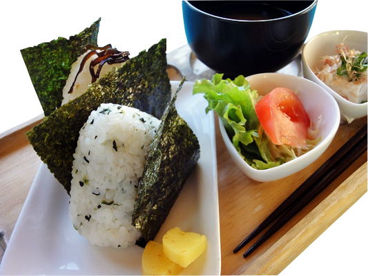 おにぎりランチ DRINK付き・・760円 ○おまかせおにぎりが 2つにサラダと おかずがセット。 |